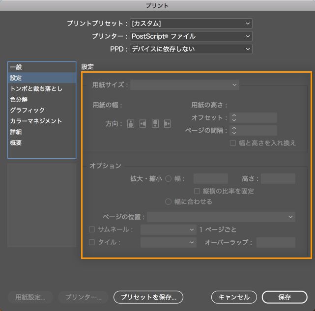InDesign 文書を PostScript ファイルとして印刷する際に、ページをカスタマイズするオプションは無効になります。