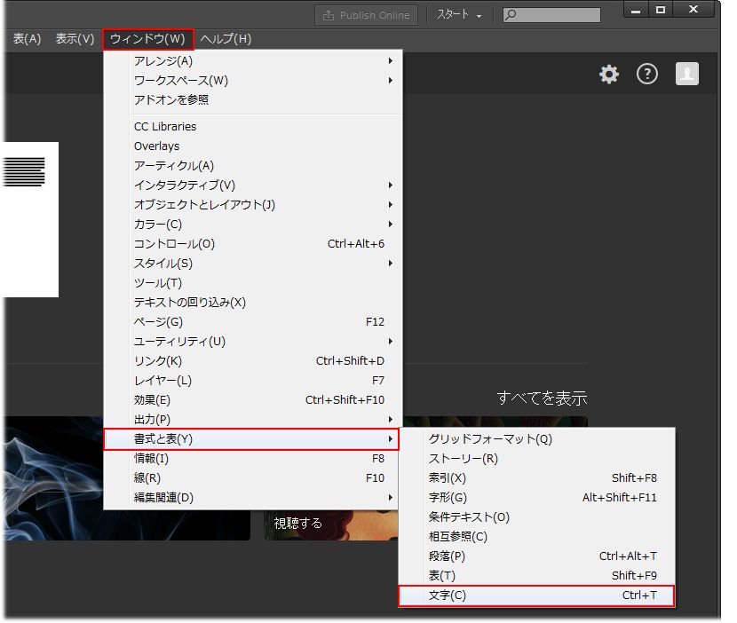 InDesign を再度起動し、ウィンドウ/書式と表/文字 を選択して再び文字パネルを表示します。