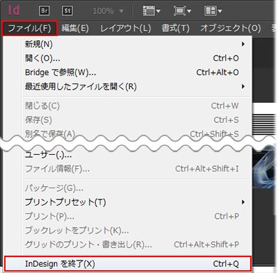 ファイル/InDesgin を終了 を選択して、一度アプリケーションを閉じます。