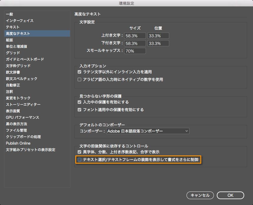 「文字の前後関係に依存するコントロール」で、「テキスト選択/テキストフレームの装飾を表示して書式をさらに制御」オプションをクリアします。