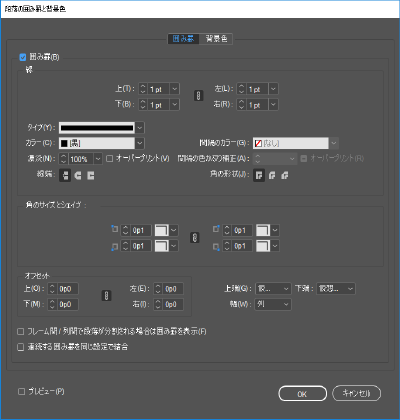 囲み罫の幅を指定します。「列」を選択すると、囲み罫がテキストフレームをまたぐ形になり、「テキスト」を選択すると、囲み罫がテキストをまたぐ形になります。