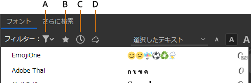 A. 有効化されたフォントフィルター B. 使用可能になったフォントの有効化アイコン C. フォントの有効化を解除アイコン D. フォントの有効化中アイコン