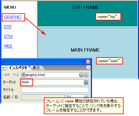 [インスペクタ] パレットで [ターゲット] 欄にフレーム名を入力するか、[ターゲット] ポップアップメニューからお望みのターゲット属性を選択します。