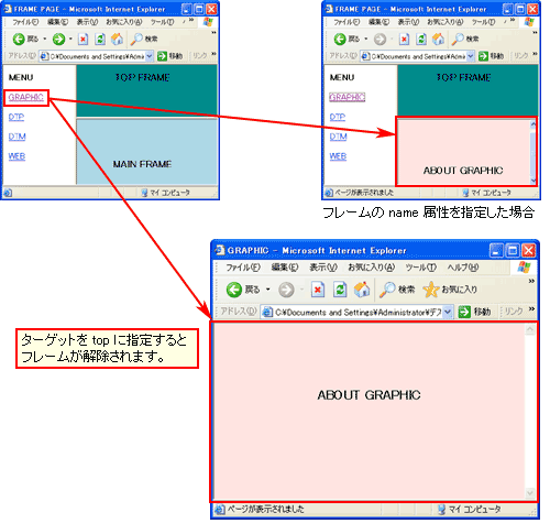 このタグに target 属性を挿入し、値を上記のいずれかにすることでリンク先ページの表示場所を指定することができます。