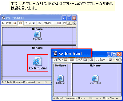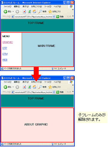 この場合、左右に分かれた子フレームから「_parent」を指定されたリンク先のページは、下フレーム全体に表示されます。フレームがネストしていない場合は、「_top」と同じ動作をします。