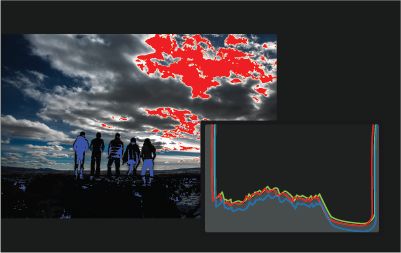 - 右上のクリッピングインジケーターが点灯している場合(クリッピングインジケーターの三角形が白になっている場合)、写真内のハイライトがクリッピングされていることを示します。点灯したインジケーターをクリックすると、写真内のハイライトが表示されます(ハイライトは赤色のオーバーレイマスクとして表示されます)。