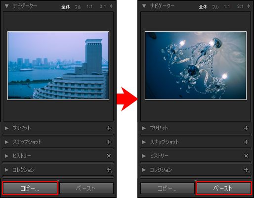 プリセットの保存を行わなくても、現像した設定内容をコピーし、別の写真に適用することが可能です。