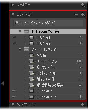 Lightroom CC では、Lightroom Classic CC で同期しているカタログ内の写真とコレクションの一覧が表示されます。