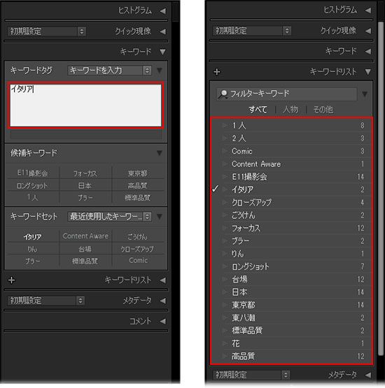 写真に任意のキーワードを追加することで、キーワードで絞り込んで写真を検索することができます。キーワードは一枚の写真に複数追加することが可能です。追加したキーワードは、すべてキーワードリストパネルに表示され、そのキーワードを含む写真の枚数が表示されます。