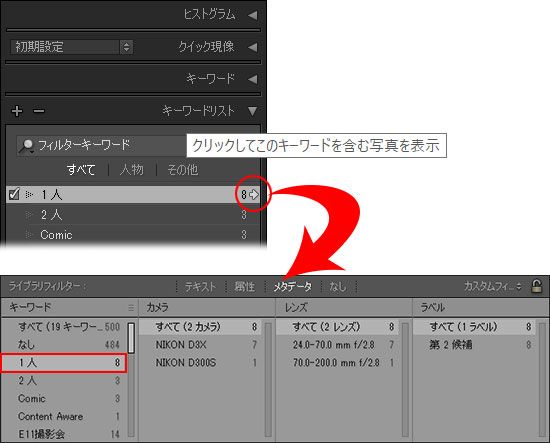 キーワードリストパネル内のキーワードをクリックすると、該当のキーワードを含む写真を抽出できます。