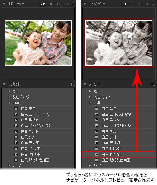 現像モジュールのプリセットパネルには、初期設定のプリセットが用意されています。このプリセットを使用して写真を手軽に補正することができます。プリセットパネルで目的のプリセットの上にポインタを移動すると、プリセットを適用した結果のプレビュー表示がナビゲータパネルにされます。 またプリセットパネルで目的のプリセットをクリックすると、プリセットを写真に適用することができます。