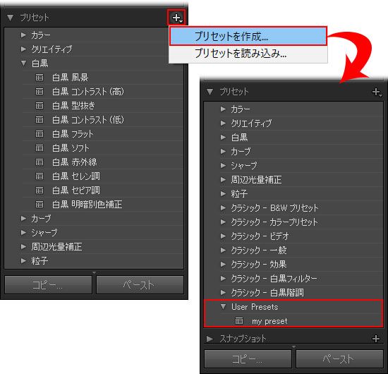 また、プリセットは独自に作成することもできます。気に入ったプリセットは、名前をつけて「ユーザープリセット」として保存しておくことで、別の写真にも作成したプリセットを適用することができます。