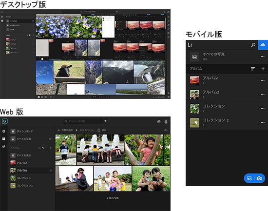Lightroom CC との同期を「オン」に設定することで、たとえばモバイル版から新しく写真を読み込んだり、写真の編集を行うと、デスクトップ版や Web 版でも変更が自動的に反映されます。