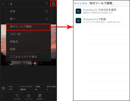 Lightroom と Adobe Photoshop Fix はシームレスに連携しているので、iPhone または iPad で写真のレタッチや復元ができます。