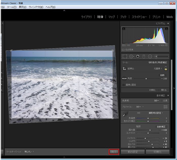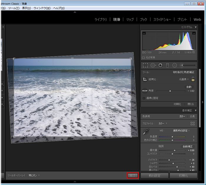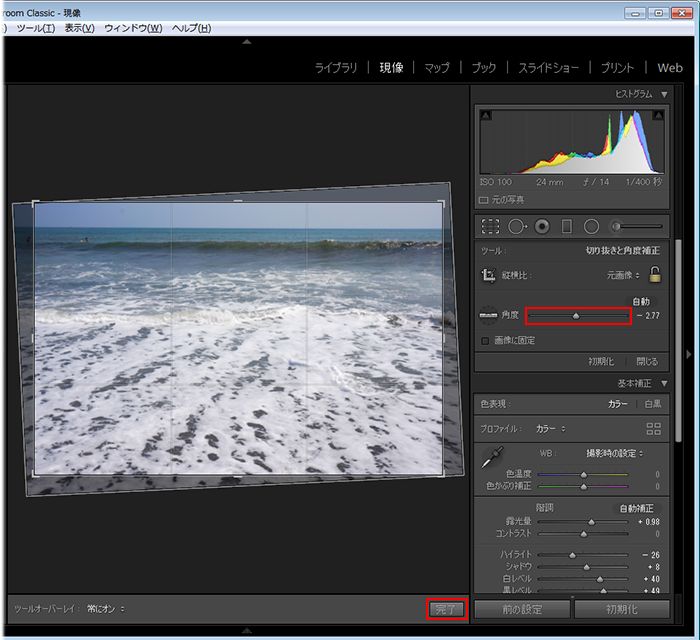 引いたラインを基準として角度が補正されます。「完了」をクリックして角度を確定します。