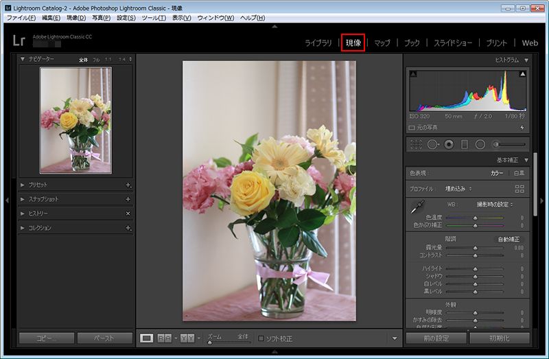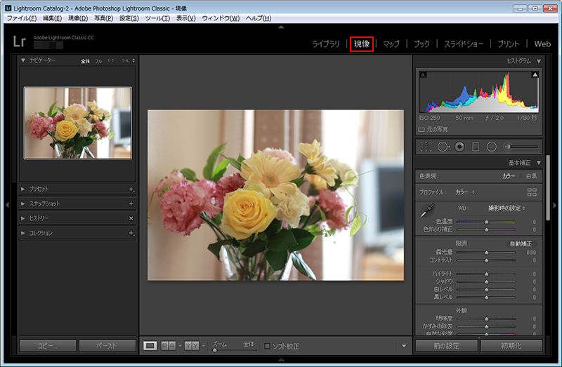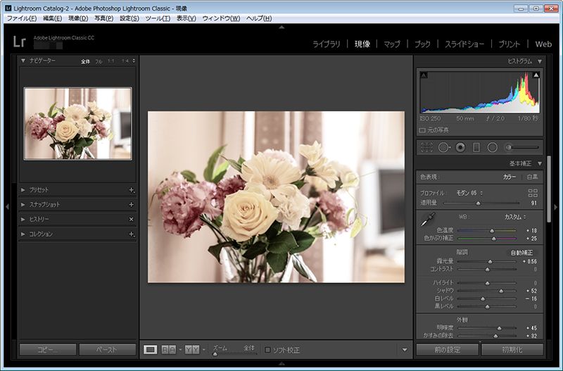 現像設定とは、現像モジュールの各設定値で、これらの設定は保存、コピー、ペーストが可能です。この機能を活用することにより、被写体と撮影条件が類似する他の写真に、同様の現像処理を簡単に適用することができます。