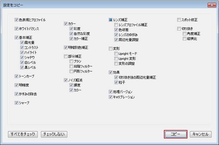 設定をコピーダイアログボックスが表示されます。コピーする項目にチェックを入れ、「コピー」ボタンをクリックします。