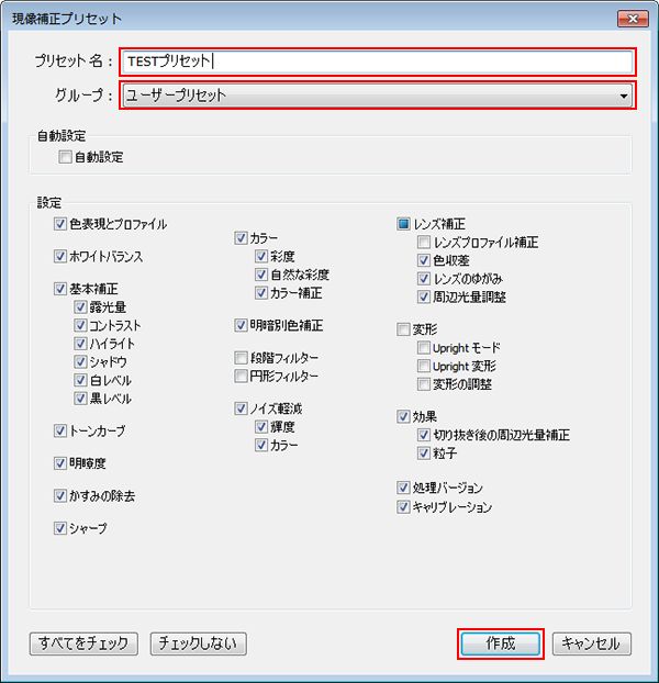 「プリセット名」ボックスに名前を入力し、プリセットを表示するフォルダーを指定します。必要に応じて写真調整の設定にチェックを入れ、「作成」ボタンをクリックします。