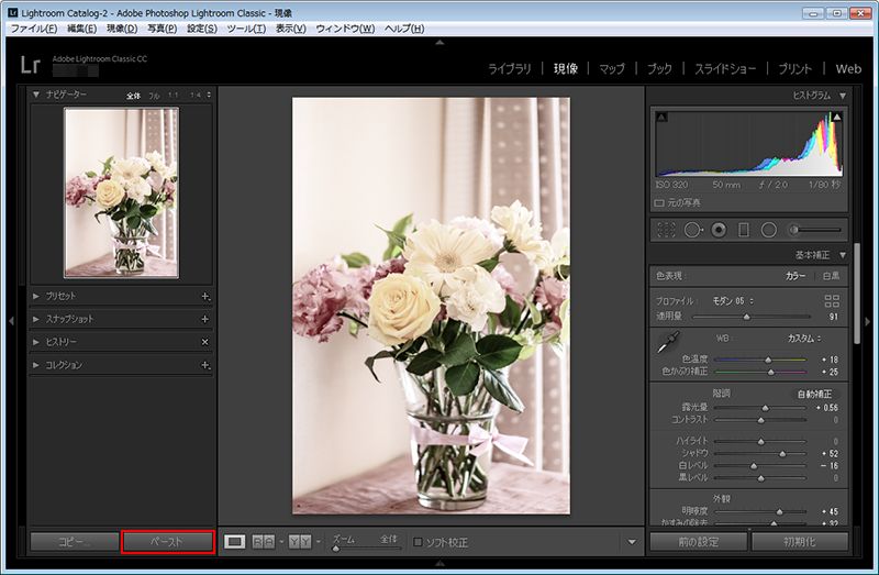 「ペースト」ボタンをクリックすると、コピーした現像設定が適用されます。