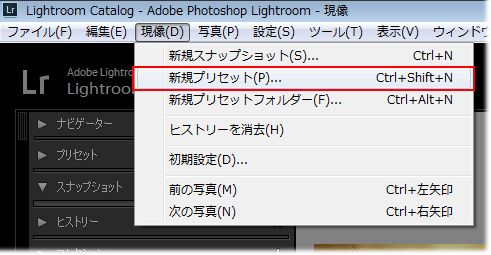 現像モジュールを開き、現像/新規プリセットを選択します。