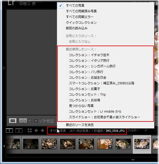 フィルムストリップパネルに表示されているファイル名部分をクリックすると、コレクションの一覧が表示されるので、任意のコレクションを選択します。