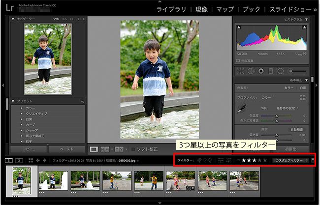 フィルムストリップパネルでは、写真の選択だけでなく、現像モジュールのまま任意のコレクションを選択したり、フラグ、レーティング、カラーラベルのフィルター機能を利用して写真を抽出したりすることもできます。