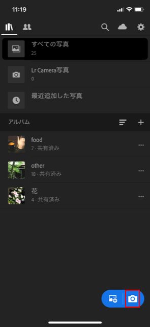 Lightroom mobile のカメラを起動するには、以下の操作を行います。