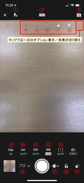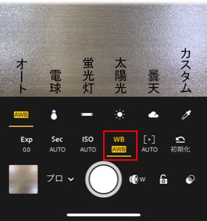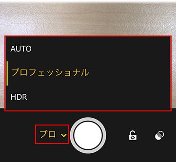 - プロフェッショナル : 露出補正、シャッタースピード、ISO 感度、ホワイトバランス、マニュアルフォーカスを自分で調整して撮影することができます。