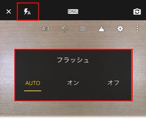 起動したカメラの上下に以下のような機能が表示されます。撮影場所の状況や必要に応じて、以下の機能を使い分けながら綺麗な写真を撮影することができます。