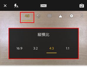 撮影サイズを 16:9、3:2、4:3、1:1 の中から選択することができます。