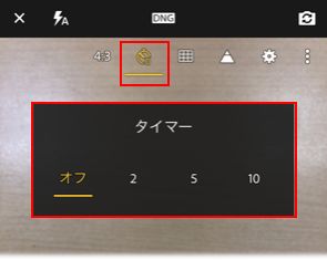 初期設定ではオフになっていますが、「2 秒」、「5 秒」、「10 秒」のいずれかからタイマーを設定することができます。