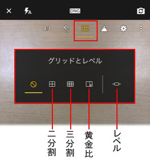 - レベル : 水平線を表示します。水準器の役割を果たします。