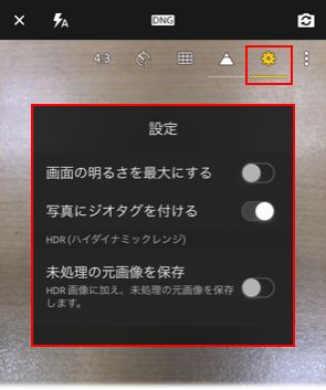 画面の明るさの設定、写真の位置情報の付加、元画像の保存が可能です。