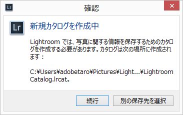 (初回起動時のみ)「新規カタログを作成中」と表示されます。「続行」をクリックするか、または「別の保存先を選択」をクリックして、カタログファイルの保存場所を指定してください。