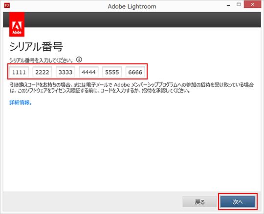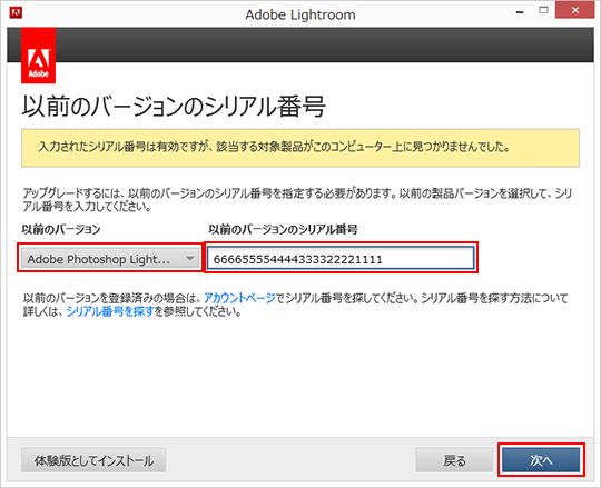 「以前のバージョンのシリアル番号」画面が表示されます。「以前のバージョン」ポップアップメニューから、お客様が所有している Photoshop Lightroom のバージョンを選択し、そのシリアル番号を入力します。