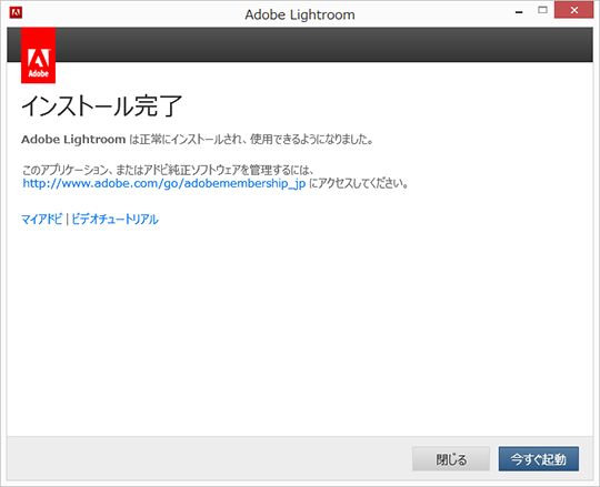 「インストール完了」と表示されます。そのまますぐに Photoshop Lightroom 6 を起動する場合は「今すぐ起動」をクリックします。一旦作業を終了する場合は「閉じる」をクリックします。