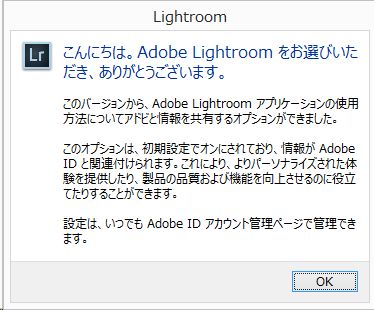 (初回起動時のみ)「こんにちは。Adobe Lightroom をお選びいただき、ありがとうございます。」と表示されたら、内容を確認の上、「OK」をクリックします。
