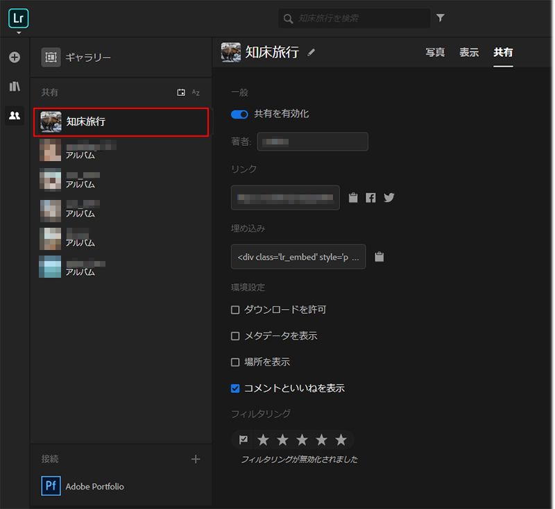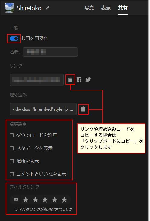 グレーアウトしていたアルバムのリンクや埋め込みコードが有効になります。必要に応じて環境設定やフィルタリングを設定し、リンクをコピーしてメール本文などに貼り付けたり、埋め込みコードをコピーして自身の HP やブログに貼り付けます。