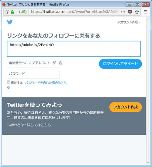 Facebook や Twitterのアイコンをクリックすると、投稿用の新規ウィンドウが表示されます。以下の画像は、Twitter ボタンを押した場合に表示される投稿ウィンドウです。
