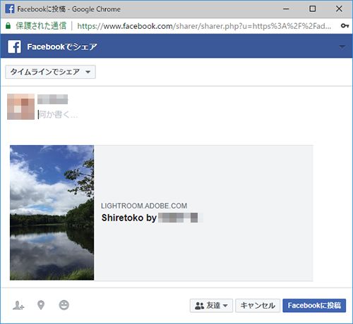 Facebook、Twitter のアイコンをクリックすると、投稿用の新規ウィンドウが表示されます。以下の画像は、Facebook ボタンを押した場合に表示される投稿ウィンドウです。