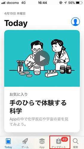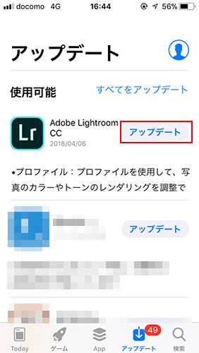 「利用可能なアップデート」の一覧に Lightroom mobile があれば、「アップデート」をタップし、アップデートを行います。