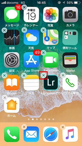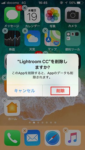 ホーム画面で Lightroom mobile アプリのアイコンを長押しし、表示される × 印 をタップします。