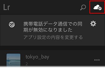 データ通信料を抑えるために「モバイルデータ通信を使用」オプションを無効にしている場合、一般回線ではなく Wifi 接続を確保する必要があります。画面上部の雲のアイコンをタップして、以下のようなメッセージが表示される場合は、Wifi に接続してから同期が反映されるか確認してください。