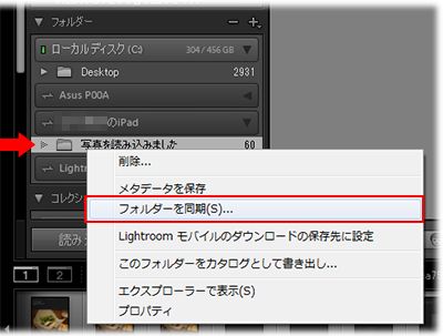 「フォルダー」パネルに表示されている端末の名称を展開し、「写真を読み込みました」を右クリックして「フォルダーを同期」を選択します。
