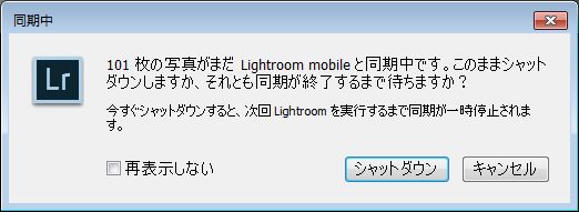 同期処理が完了する前に Lightroom Classic CC を終了しようとすると、「X 枚の写真がまだ Lightroom mobile と同期中です。」というメッセージが表示されます。そのままシャットダウンすると、次回 Lightroom Classic CC 起動時まで同期処理が保留になるため、Lightroom mobile には反映されません。