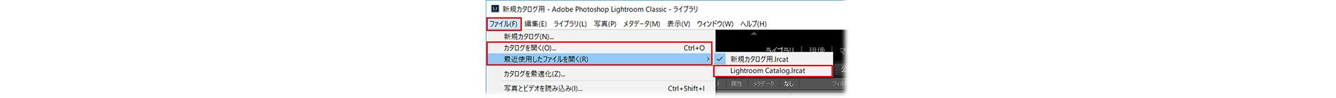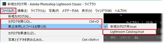 ファイルメニューから、「カタログを開く」または「最近使用したファイルを開く」をクリックし、元のカタログを選択して開きます。