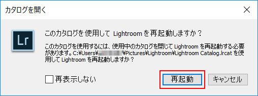 「このカタログを使用して Lightroom を再起動しますか?」というメッセージが表示されたら、「再起動」ボタンをクリックします。