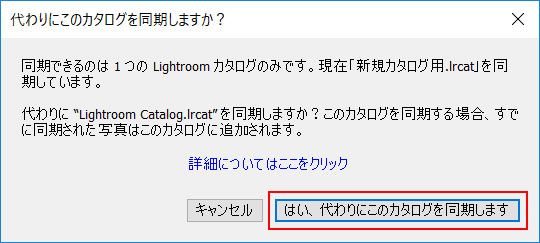 再起動後、「代わりにこのカタログを同期しますか?」ダイアログボックスが表示されます。「はい、代わりにこのカタログを同期します」ボタンをクリックします。