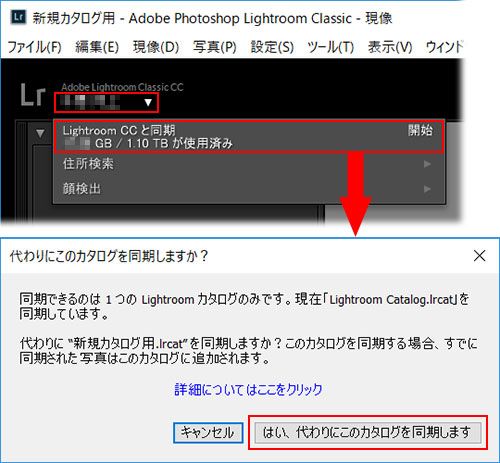 ※ 上記ダイアログボックスが表示されない場合や、上記ダイアログボックスで「キャンセル」を選択した場合は、画面左上のアカウント名部分をクリックし、表示された「Lightroom CC と同期」をクリックします。その後、「代わりにこのカタログを同期しますか?」ダイアログボックスで「はい、このカタログを同期します」ボタンをクリックします。