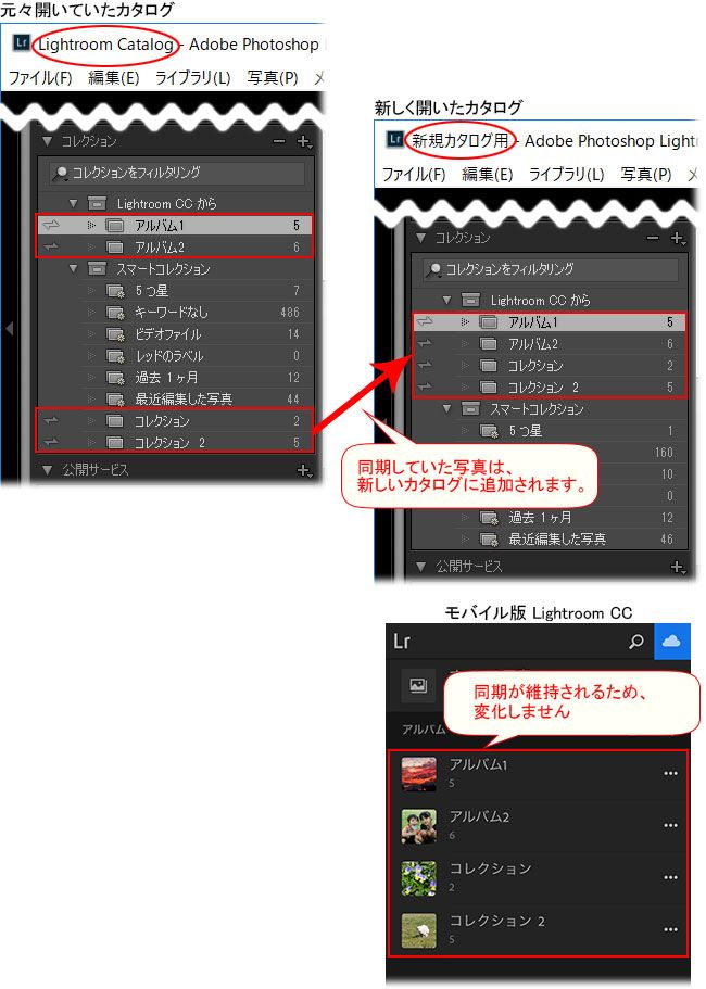 メッセージに従い新しく開いたカタログを Lightroom CC と同期すると、元々開いていたカタログで同期されていた写真は新しく開いたカタログに追加されます。